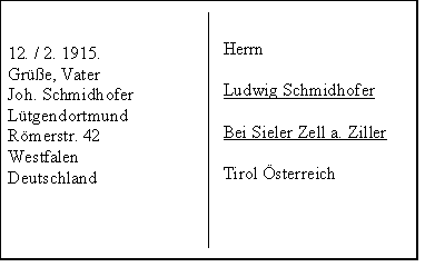 Aufgrund der wirtschaftlichen Lage wanderte er, im Alter von ungefähr 57 Jahren, zwischen 1911 und 1915 nach Deutschland aus. Er fand Arbeit in einer Zeche in Lüttgen-Dortmund. Auf einer Karte, datiert auf den 12.Februar.1915, ist er mit seiner Tochter Christel zu sehen. Die Karte ist adressiert an seinen Sohn Ludwig. | Sofia SCHMIDHOFER |