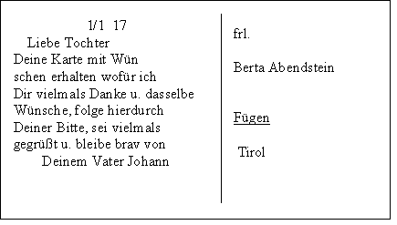 Berta Abendstein wurde als uneheliches Kind der Sophie Abendstein (* 05.Mai.1875) geboren. Aus dieser Beziehung ging noch ein weiteres Kind hervor - Thresa Abendstein - die später Johann Haun heiratete. Berta und Hansl Haun gingen aus dieser Ehe hervor. Einziger Hinweis zu dem leiblichen Vater von Berta Abendstein ist eine Karte aus dem ersten Weltkrieg von Johann (Nachname unbekannt) an seine Tochter Berta. Der Stiefvater von Berta und Thresa wurde der spätere Mann von Sophie Abendstein - Josef Hauser - (* 05.August.1879). Aus der Ehe mit Josef Hauser gingen die Kinder Josef und Loisi hervor. | |
